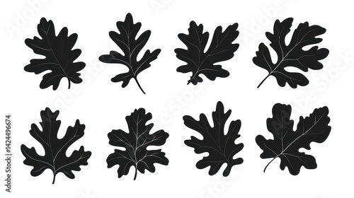 Eight oak leaf silhouettes, nature design elements, white background, graphic design