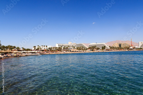 Eilat resort hotel panorama with beach at Red Sea, Israel