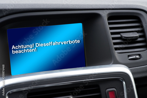 Ein Auto und ein Bordcomputer mit dem Hinweis auf Diesel Fahrverbote