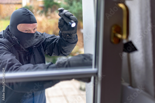 Einbrecher will mit einer Brechstange eine Haustür aufhebeln