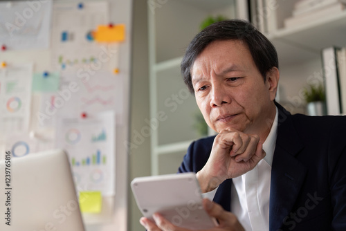 Elderly Asian businessman analyzing data on a smartphone while working in a modern office environment.