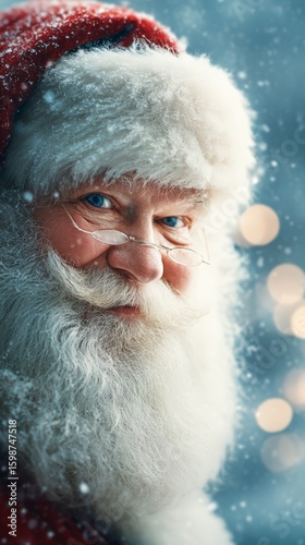 Elderly caucasian male santa claus with white beard and glasses in festive christmas setting