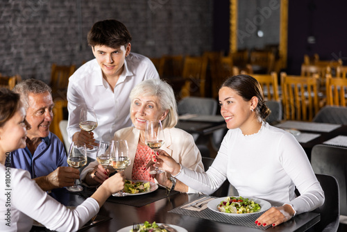 Elderly couple and young couple and adult woman have dinner and drink wine together in restaurant