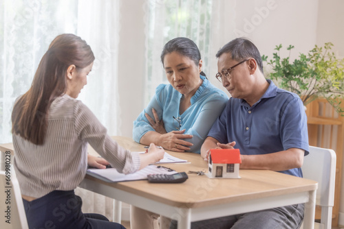 Elderly couples satisfying retirement home purchase with contract and key handover from a saleswoman