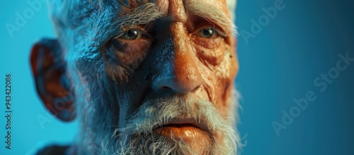 Elderly gentleman with a throat ailment against a blue backdrop with copy space image