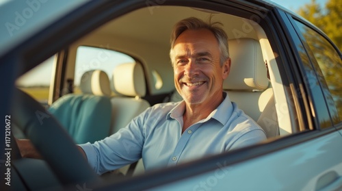 Elderly man in a car with an open window.