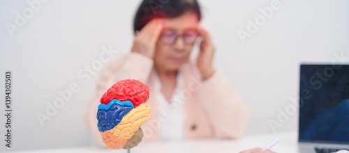 Elderly Patient consulting Doctor to Brain disease, Senior Health Medical Diagnosis. Anatomy Brain model for Explanation, Brain Tumor, neurological disorders, Dementia, alzheimer, parkinson and Mental