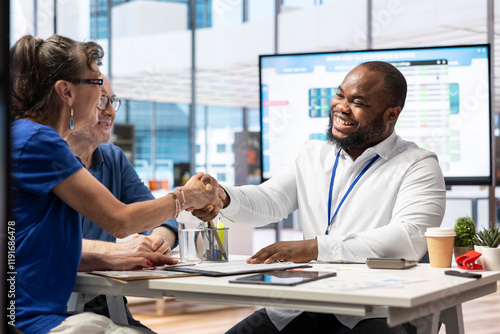 Elderly woman shaking hands with financial broker in modern office, reaching an agreement and signing contract for a new retirement plan. Satisfied client thanking advisor for guidance.