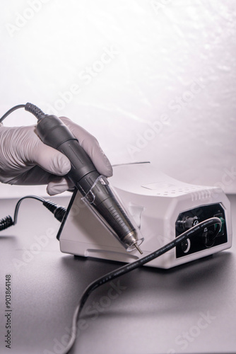 electric manicure cutter on a dark background. electric drill for nail. concept of beauty and health