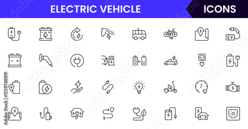 Electric vehicle web line icon collection, sleek, vector illustrations featuring stations, batteries, and eco-friendly symbols, perfect for sustainable tech designs.