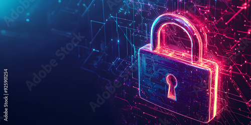 Electronic circuit futuristic neon padlock. Copy paste empty place for text. Cyber, personal data, privacy information security. Internet networking protection security system cybersecurity concept