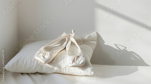 Elegant ballet shoes resting on a soft pillow in natural light.