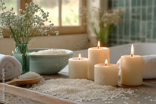 Elegant bathroom set with sea salt and essential oils, arranged with candles and towels, creating a soothing spa-like atmosphere with natural wellness products.