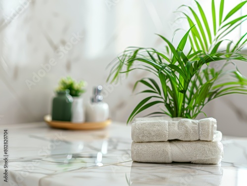 Elegant bathroom setting with a close-up, high-resolution view of an exotic green plant on a marble countertop, contributing to a spa-like atmosphere