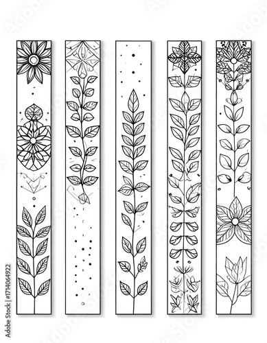 Elegant black and white botanical designs in a vertical arrangement, showcasing detailed floral and leaf motifs, perfect for stationary or print.