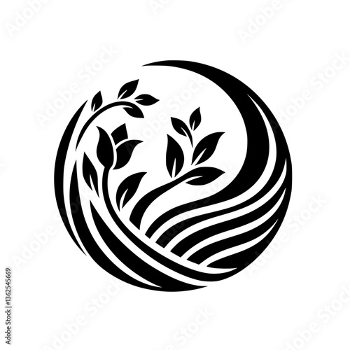 Elegant Black and White Floral Emblem Featuring a Circular Composition with Lush Leaves and Organic Flow.