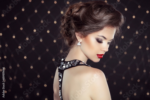 Elegant brunette woman lady with makeup and hairstyle. Fashion g