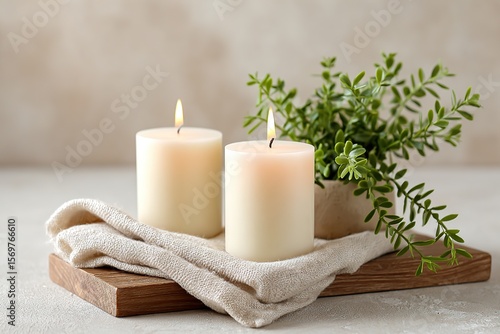 Elegant candles and small green plant create a serene atmosphere in a cozy setting