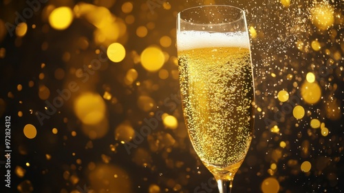 elegant champagne flute filled with sparkling golden liquid surrounded by a halo of digital particles bubbles rise through the effervescent drink merging with the technological aura