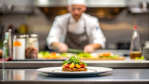 Elegant chef preparing delicious dish in professional kitchen for catering event or restaurant menu