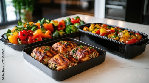 Elegant Chicken Roulade and Roasted Vegetables on Marble Countertop, Gourmet Meal with Broccoli, Peppers, and Tomatoes, Fine Dining Presentation, Home Cooking