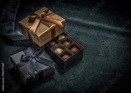 Elegant Chocolate Gift Boxes with Bows and Ribbons on Dark Background for Gourmet Treats and Special Occasions