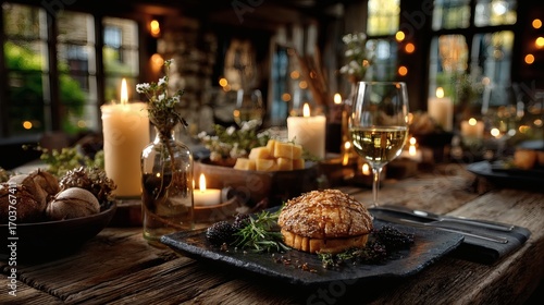 Elegant Christmas dinner table candles wine festive plates rustic wooden interior warm cozy holiday celebration family gathering decor photography