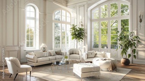 Elegant classic living room with large windows and luxurious white sofas, traditional paneling on walls, bright and airy