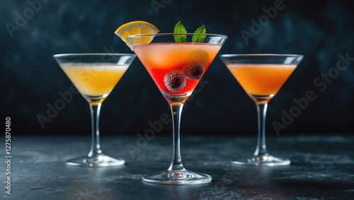 Elegant collection of colorful cocktails in martini glasses against a dark background showcasing vibrant garnishes and refreshing appeal