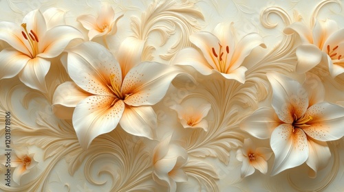 Elegant cream lilies with intricate floral patterns on a textured background, ideal for decor
