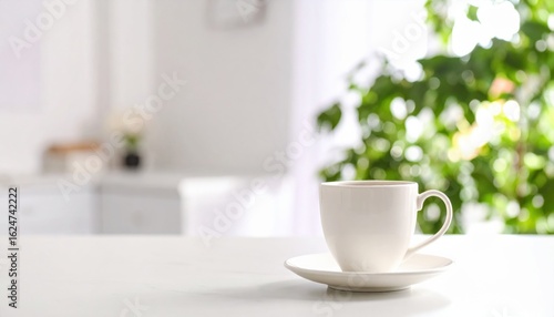Elegant Cup and Saucer Arranged on Minimalist White Table Creating a Cozy and Inviting Atmosphere