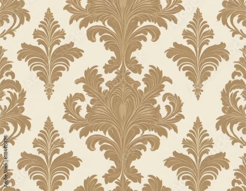 Elegant Damask Wallpaper Pattern: Luxurious Gold and Cream Floral Design, Seamless Repeat Texture