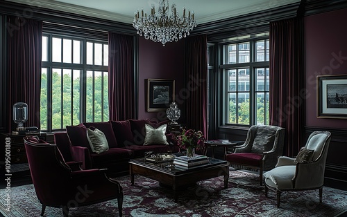 Elegant dark red living room with crystal chandelier, plush furniture, and city view.