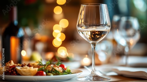Elegant dining experience with wine, gourmet food, and soft ambient lighting