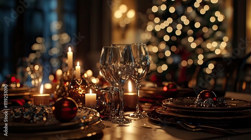 Elegant dining table prepared for a New Year feast, adorned with exquisite tableware, flickering candles, and sparkling lights that create a festive ambiance.