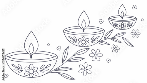 Elegant Diwali Diyas Line Art with Floral Accents. Traditional Indian Oil Lamps Illustration for Festival Decoration.