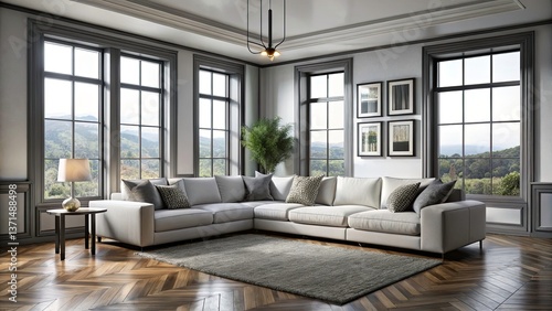 Elegant Dove Gray Living Room Interior Design - Panoramic Window, White Sectional Sofa, Black Frames - Modern Home Decor