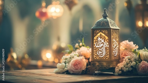 Elegant Eid Mubarak calligraphy on a lantern, soft floral accents create festive spirit
