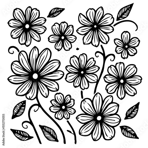 Elegant floral pattern design with outlined flowers and foliage elements