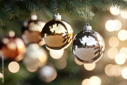 Elegant glass ornaments on christmas tree with twinkling lights