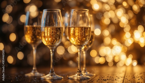 Elegant glasses of sparkling wine are set against a backdrop of warm, glowing lights, creating a festive and celebratory atmosphere.