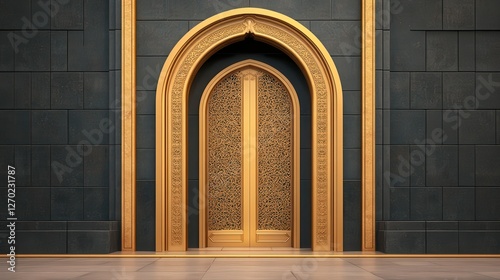 Elegant Golden Arch Doorway Design with Intricate Patterns and Dark Wall Background