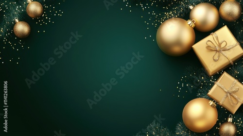 Elegant Golden Christmas Tree Ornaments with Gifts on Deep Green Background