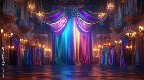 Elegant Grand Hall with Colorful Drapery and Soft Golden Lighting