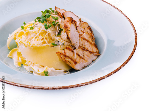 Elegant grilled chicken breast with cheese and cream sauce