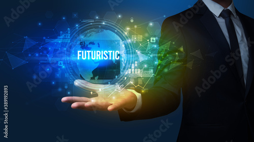 Elegant hand holding FUTURISTIC inscription, digital technology concept