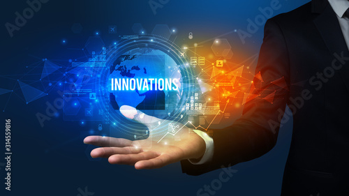 Elegant hand holding INNOVATIONS inscription, digital technology concept