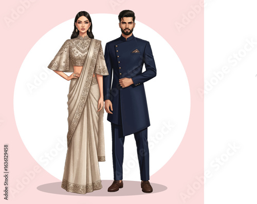 Elegant Indian Couple in Traditional Modern Attire – Fashion Illustration