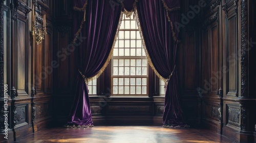 Elegant interior featuring rich wooden walls and luxurious purple drapes framing a large window.