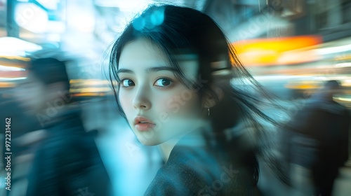 Elegant Japanese woman navigating a bustling city crowd her journey captured in a blurred cinematic